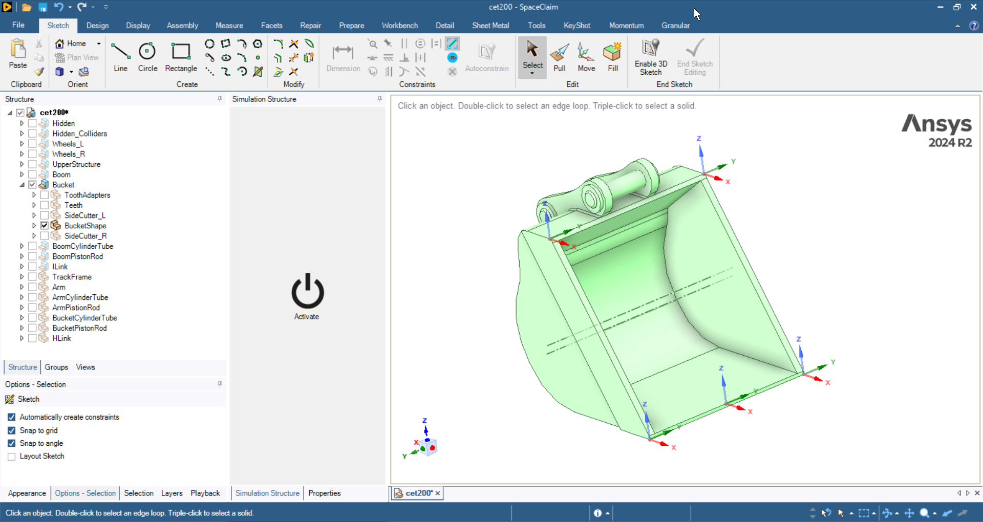 Design ウィンドウ上のオブジェクトのないところで Ctrl+a を入力し、CADモデルのバケットを選択する